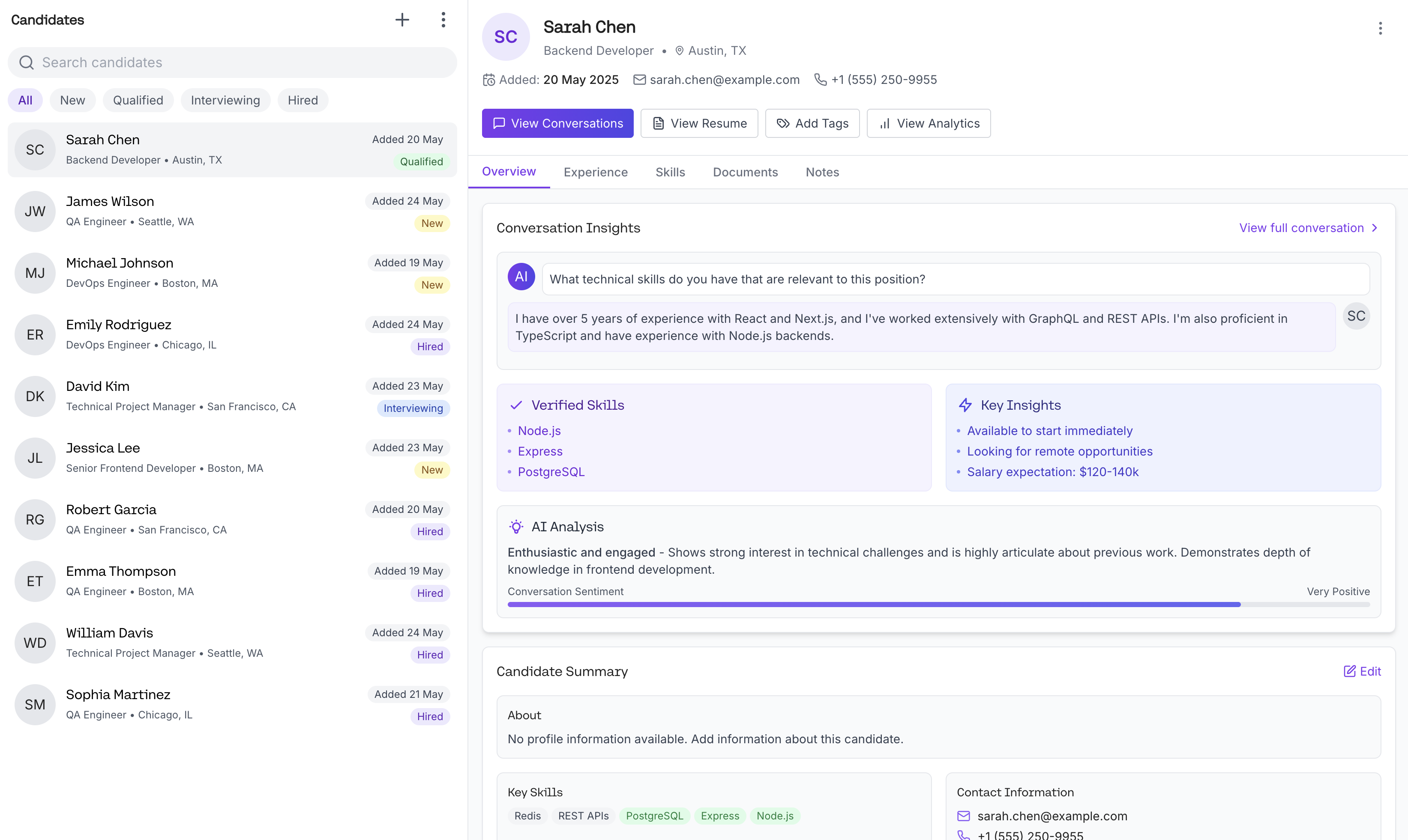 Our AI-powered candidate management system helps you find the perfect match through conversation-driven analytics and skill verification.